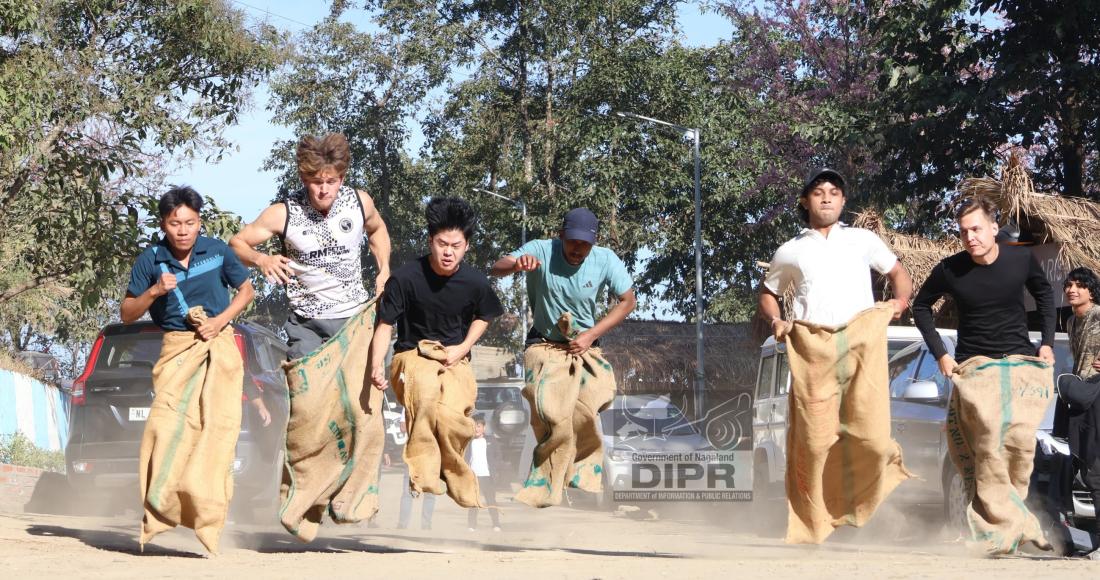 Tourists participating in the Sack Race Competition organised by the Department of Youth Resource & Sports as part of the Hornbill Festival Celebrations at Naga Heritage Village, Kisama on 4th December 2025.