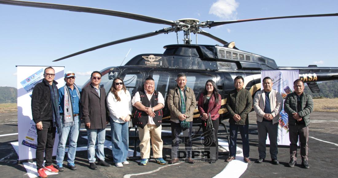 The helicopter service has been initiated by Thumby Aviation Pvt. Ltd in collaboration with the Tourism Department, Nagaland, with the aim of enhancing tourism experiences during the Hornbill Festival. The launch marks a significant stride toward offering chartered aerial experiences and improved connectivity for tourists visiting the State.