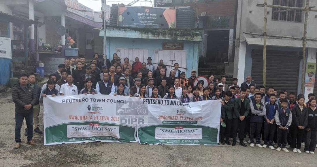 Swachhata Hi Seva 2025 in collaboration with Eco-Club, TMTHSS under the theme "Swachhotsav" focusing on clean and green festivities and zero waste community celebration was held at Pfutsero Main Town on 17th September 2025. ADC and Executive Officer, Pfutsero Town Council, Mhalo Humtsoe spoke on the topic the importance of waste segregation, my waste my responsibility and to avoid dumping of  waste in the nallas/drainage. Director, Kolos Society Pfutsero, Kupellhi Losou, in his speech, said that Pfutsero is considered as one of the most beautiful towns where public leaders, colony leaders and Administration are doing their best to keep the towns beautiful and clean whereas public are throwing non degradable and waste  items in the drainage  during rainy season which bloc the drainage and make  dirty.